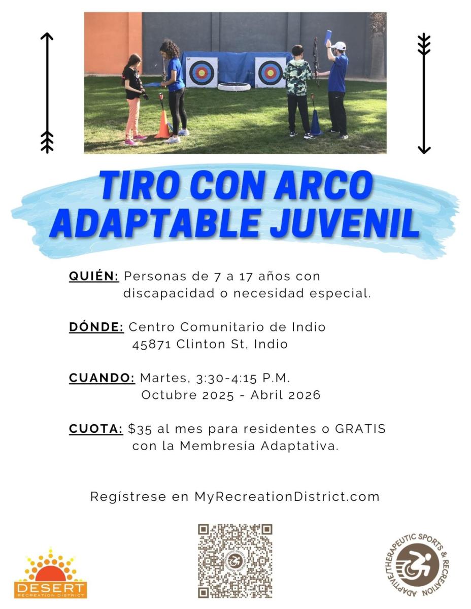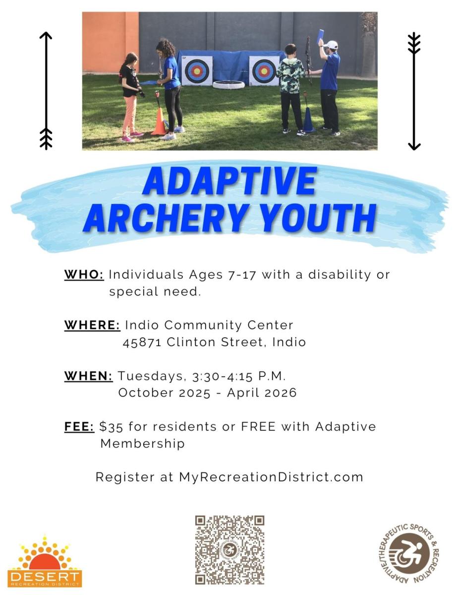 Adaptive Archery – YOUTH Desert Recreation District - Indio Community Center Adaptive Sports Event December 2, 2025 - 3:30pm - 4:15pmDecember 16, 2025 - 3:30pm - 4:15pmDecember 23, 2025 - 3:30pm - 4:15pmDecember 30, 2025 - 3:30pm - 4:15pmJanuary 6, 2026 - 3:30pm - 4:15pmJanuary 13, 2026 - 3:30pm - 4:15pmJanuary 20, 2026 - 3:30pm - 4:15pmJanuary 27, 2026 - 3:30pm - 4:15pmFebruary 3, 2026 - 3:30pm - 4:15pmFebruary 10, 2026 - 3:30pm - 4:15pmFebruary 17, 2026 - 3:30pm - 4:15pmFebruary 24, 2026 - 3:30pm - 4:15pm