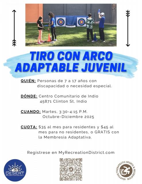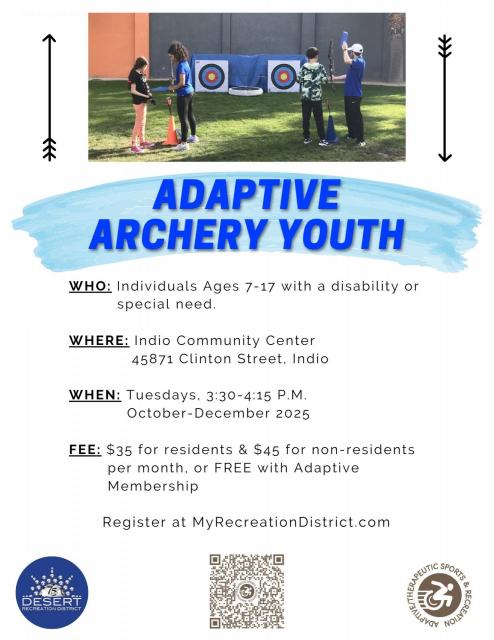 Adaptive Archery – YOUTH Desert Recreation District - Indio Community Center Adaptive Sports Event October 7, 2025 - 3:30pm - 4:15pmOctober 14, 2025 - 3:30pm - 4:15pmOctober 21, 2025 - 3:30pm - 4:15pmOctober 28, 2025 - 3:30pm - 4:15pmNovember 4, 2025 - 3:30pm - 4:15pmNovember 11, 2025 - 3:30pm - 4:15pmNovember 18, 2025 - 3:30pm - 4:15pmNovember 25, 2025 - 3:30pm - 4:15pm