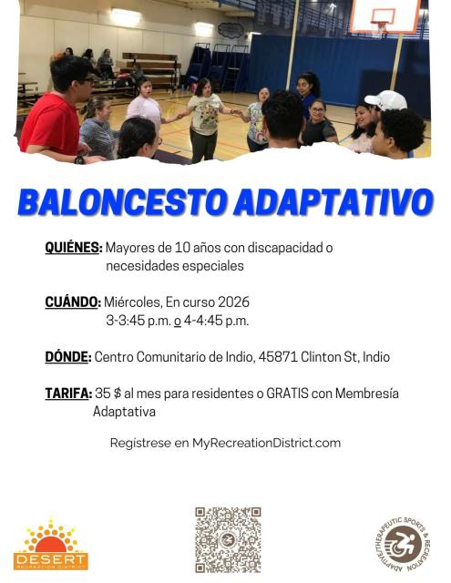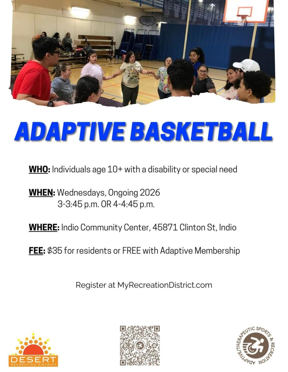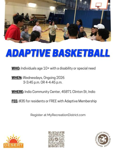 Adaptive Basketball [Wednesdays 10+] Desert Recreation District - Indio Community Center Adaptive Sports Event December 3, 2025 - 3:00pm - 3:45pmDecember 3, 2025 - 4:00pm - 4:45pmDecember 17, 2025 - 3:00pm - 3:45pmDecember 17, 2025 - 4:00pm - 4:45pmJanuary 7, 2026 - 3:00pm - 3:45pmJanuary 7, 2026 - 4:00pm - 4:45pmJanuary 14, 2026 - 3:00pm - 3:45pmJanuary 14, 2026 - 4:00pm - 4:45pmJanuary 21, 2026 - 3:00pm - 3:45pmJanuary 21, 2026 - 4:00pm - 4:45pmJanuary 28, 2026 - 3:00pm - 3:45pmJanuary 28, 2026 - 4:00pm - 4:45pm