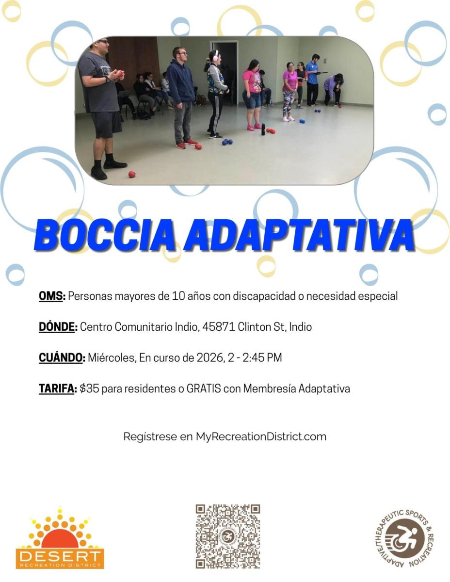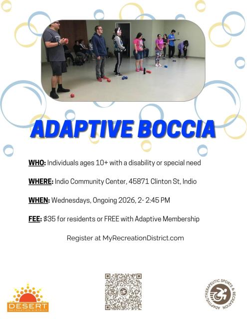 Adaptive Boccia Desert Recreation District - Indio Community Center Adaptive Sports Event December 3, 2025 - 2:00pm - 2:45pmDecember 17, 2025 - 2:00pm - 2:45pmJanuary 7, 2026 - 2:00pm - 2:45pmJanuary 14, 2026 - 2:00pm - 2:45pmJanuary 21, 2026 - 2:00pm - 2:45pmJanuary 28, 2026 - 2:00pm - 2:45pmFebruary 4, 2026 - 2:00pm - 2:45pmFebruary 11, 2026 - 2:00pm - 2:45pmFebruary 18, 2026 - 2:00pm - 2:45pmFebruary 25, 2026 - 2:00pm - 2:45pm