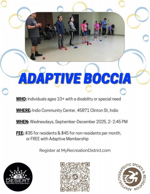 Adaptive Boccia Desert Recreation District - Indio Community Center Adaptive Sports Event September 3, 2025 - 2:00pm - 2:45pmSeptember 10, 2025 - 2:00pm - 2:45pmSeptember 17, 2025 - 2:00pm - 2:45pmSeptember 24, 2025 - 2:00pm - 2:45pmOctober 1, 2025 - 2:00pm - 2:45pmOctober 8, 2025 - 2:00pm - 2:45pmOctober 15, 2025 - 2:00pm - 2:45pmOctober 22, 2025 - 2:00pm - 2:45pmOctober 29, 2025 - 2:00pm - 2:45pmNovember 5, 2025 - 2:00pm - 2:45pmNovember 12, 2025 - 2:00pm - 2:45pmNovember 19, 2025 - 2:00pm - 2:45pmNovember 26, 2025 - 2:00pm - 2:45pm