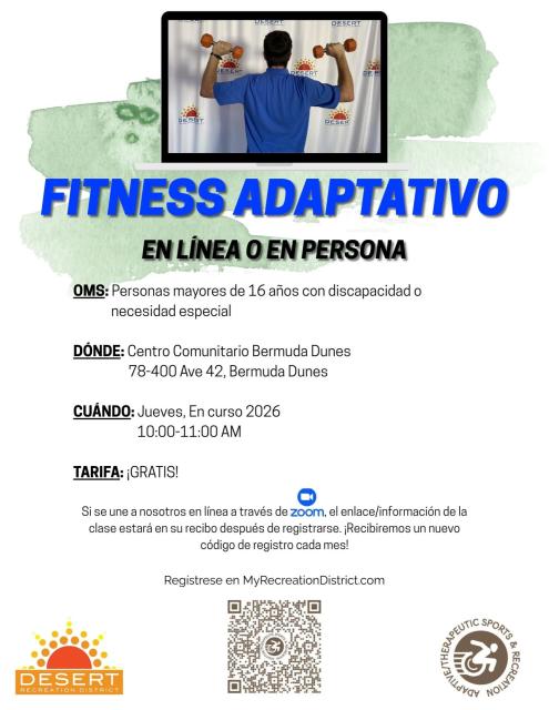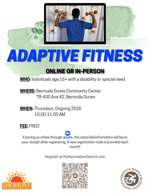 Adaptive Fitness – Hybrid [16+] Desert Recreation District - Bermuda Dunes Community Center & Online via Zoom Adaptive Sports Event December 4, 2025 - 10:00am - 11:00amDecember 11, 2025 - 10:00am - 11:00amDecember 18, 2025 - 10:00am - 11:00amJanuary 8, 2026 - 10:00am - 11:00amJanuary 15, 2026 - 10:00am - 11:00amJanuary 22, 2026 - 10:00am - 11:00amJanuary 29, 2026 - 10:00am - 11:00amFebruary 5, 2026 - 10:00am - 11:00amFebruary 12, 2026 - 10:00am - 11:00amFebruary 19, 2026 - 10:00am - 11:00amFebruary 26, 2026 - 10:00am - 11:00am