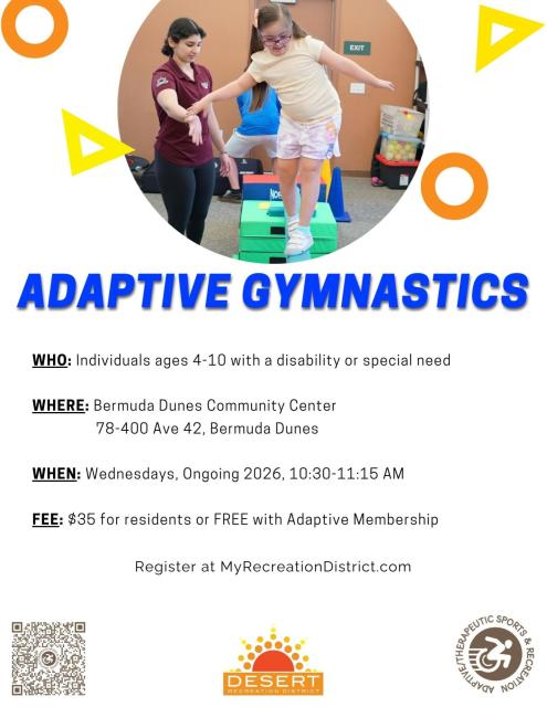 Adaptive Gymnastics [ages 4-10] Desert Recreation District - Bermuda Dunes Community Center Adaptive Sports Event December 3, 2025 - 10:30am - 11:15amDecember 10, 2025 - 10:30am - 11:15amDecember 17, 2025 - 10:30am - 11:15amJanuary 7, 2026 - 10:30am - 11:15amJanuary 14, 2026 - 10:30am - 11:15amJanuary 21, 2026 - 10:30am - 11:15amJanuary 28, 2026 - 10:30am - 11:15amFebruary 4, 2026 - 10:30am - 11:15amFebruary 11, 2026 - 10:30am - 11:15amFebruary 18, 2026 - 10:30am - 11:15amFebruary 25, 2026 - 10:30am - 11:15am