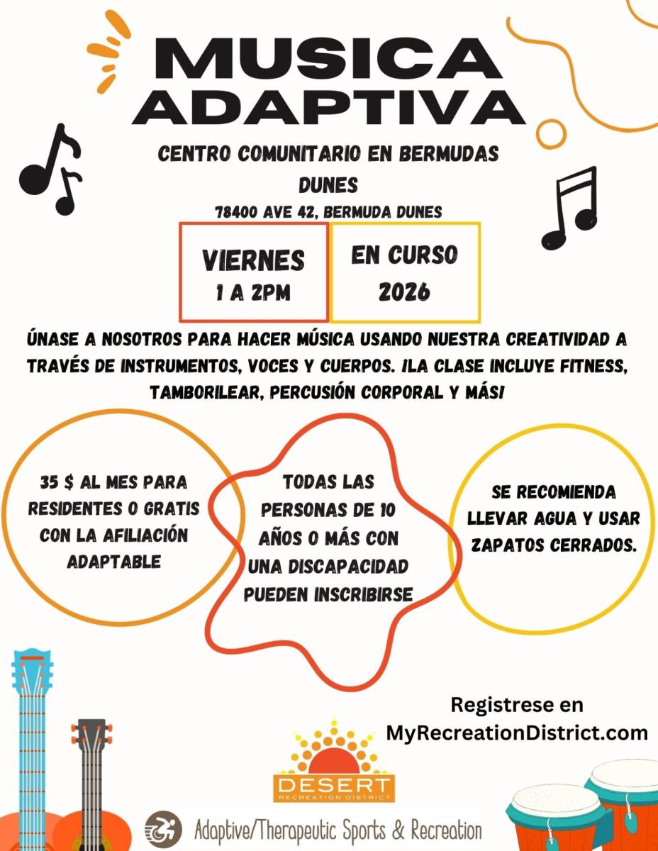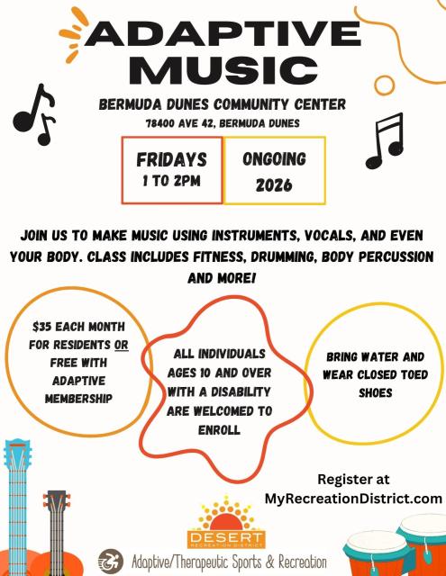 Adaptive Music Desert Recreation District - Bermuda Dunes Community Center Adaptive Sports Event December 5, 2025 - 1:00pm - 2:00pmDecember 12, 2025 - 1:00pm - 2:00pmDecember 19, 2025 - 1:00pm - 2:00pmDecember 26, 2025 - 1:00pm - 2:00pmJanuary 2, 2026 - 1:00pm - 2:00pmJanuary 9, 2026 - 1:00pm - 2:00pmJanuary 16, 2026 - 1:00pm - 2:00pmJanuary 23, 2026 - 1:00pm - 2:00pmJanuary 30, 2026 - 1:00pm - 2:00pmFebruary 6, 2026 - 1:00pm - 2:00pmFebruary 13, 2026 - 1:00pm - 2:00pmFebruary 20, 2026 - 1:00pm - 2:00pmFebruary 27, 2026 - 1:00pm - 2:00pm