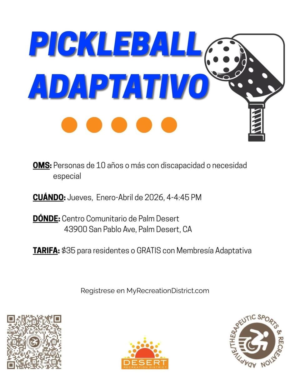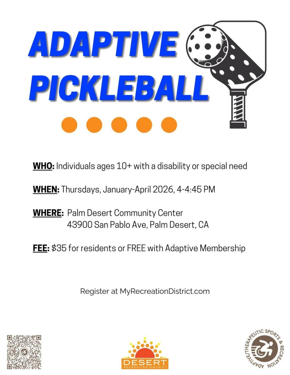 Adaptive Pickleball Desert Recreation District - Palm Desert Community Center Adaptive Sports Event December 4, 2025 - 4:00pm - 4:45pmDecember 11, 2025 - 4:00pm - 4:45pmDecember 18, 2025 - 4:00pm - 4:45pmJanuary 8, 2026 - 4:00pm - 4:45pmJanuary 15, 2026 - 4:00pm - 4:45pmJanuary 22, 2026 - 4:00pm - 4:45pmJanuary 29, 2026 - 4:00pm - 4:45pm