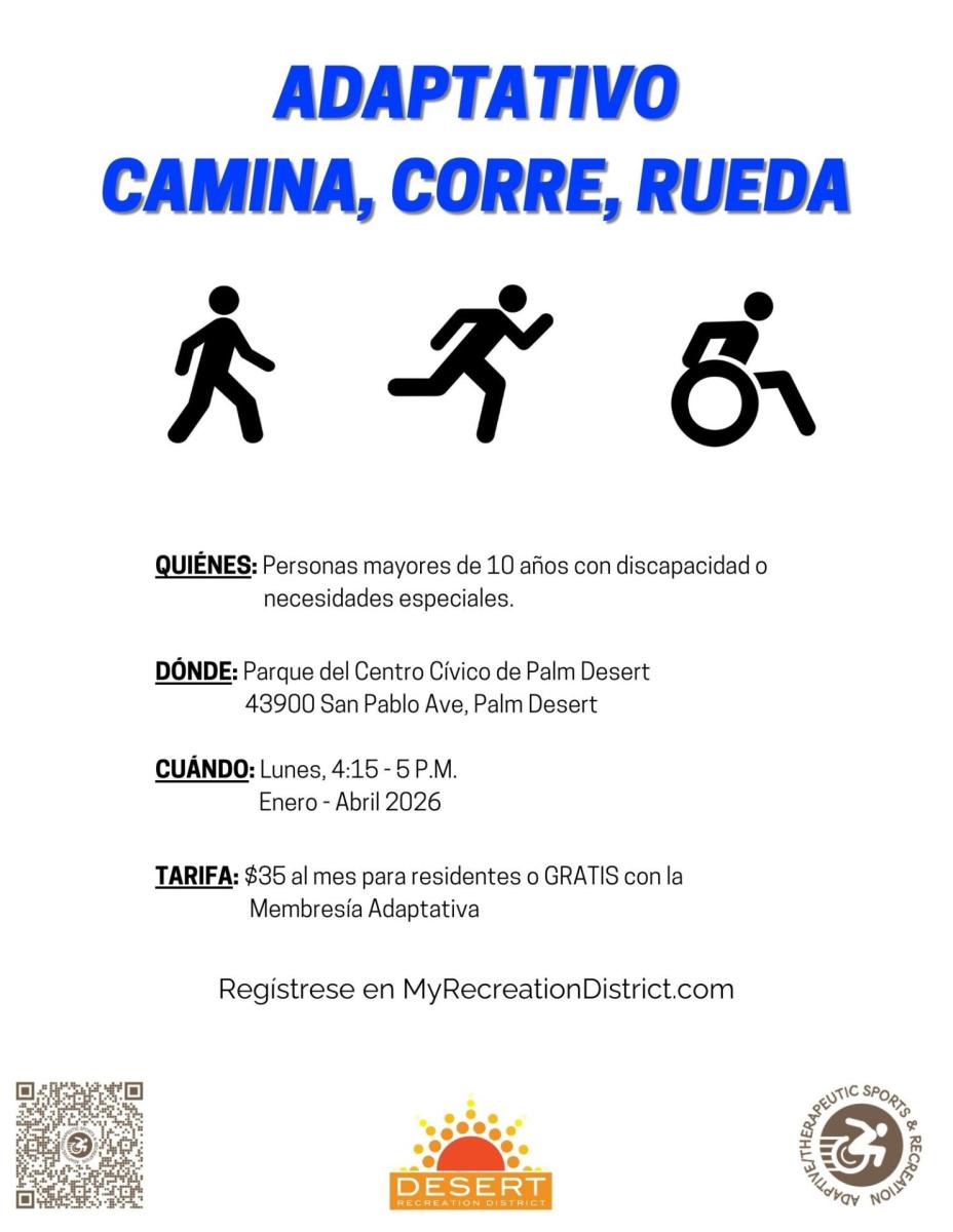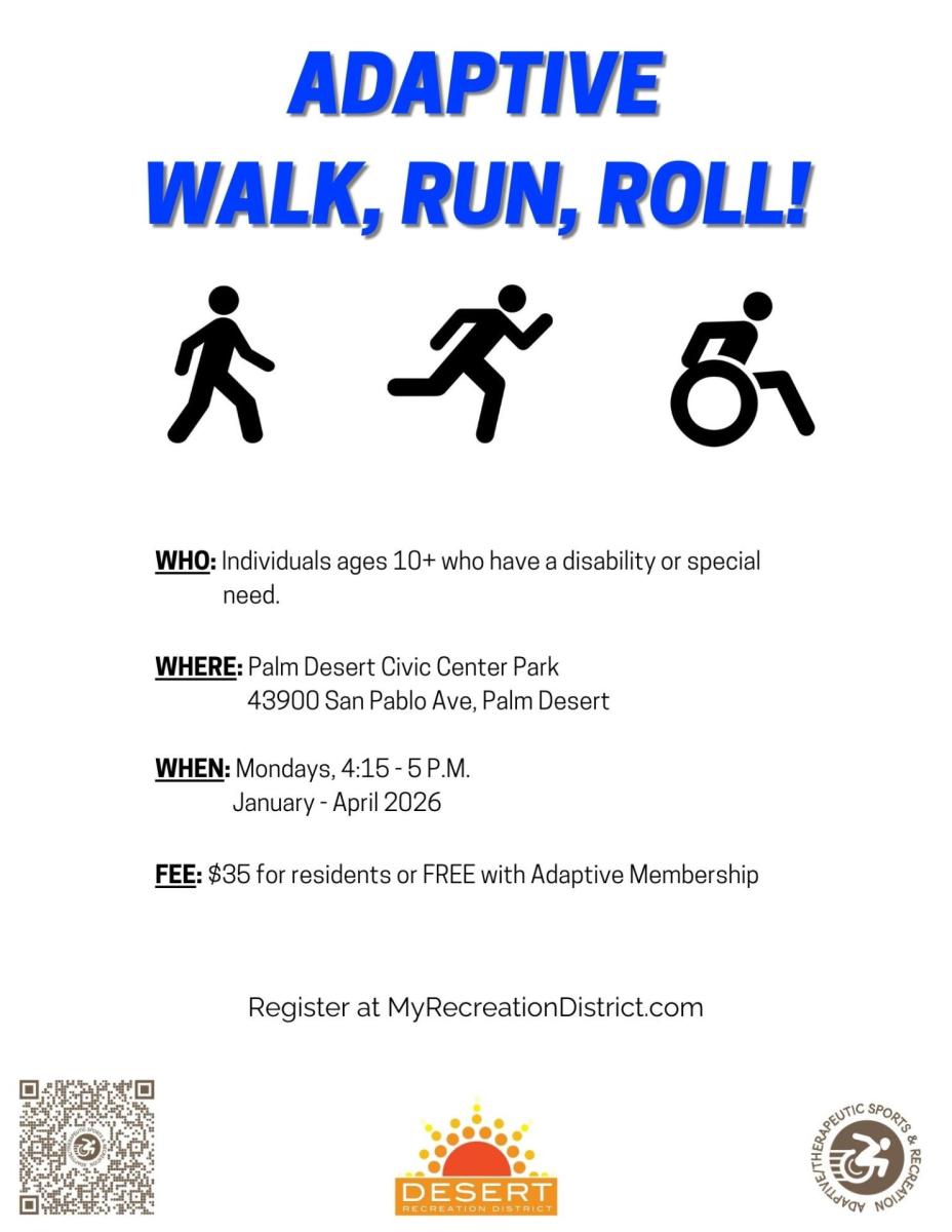 Adaptive Walk, Run, Roll [Mondays] Desert Recreation District - Palm Desert Civic Center Adaptive Sports Event March 2, 2026 - 4:15pm - 5:00pmMarch 9, 2026 - 4:15pm - 5:00pmMarch 16, 2026 - 4:15pm - 5:00pmMarch 23, 2026 - 4:15pm - 5:00pmMarch 30, 2026 - 4:15pm - 5:00pmApril 6, 2026 - 4:15pm - 5:00pmApril 13, 2026 - 4:15pm - 5:00pmApril 20, 2026 - 4:15pm - 5:00pmApril 27, 2026 - 4:15pm - 5:00pm