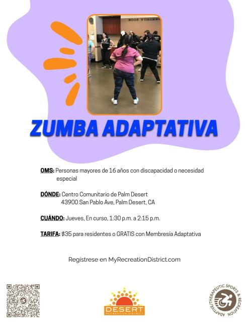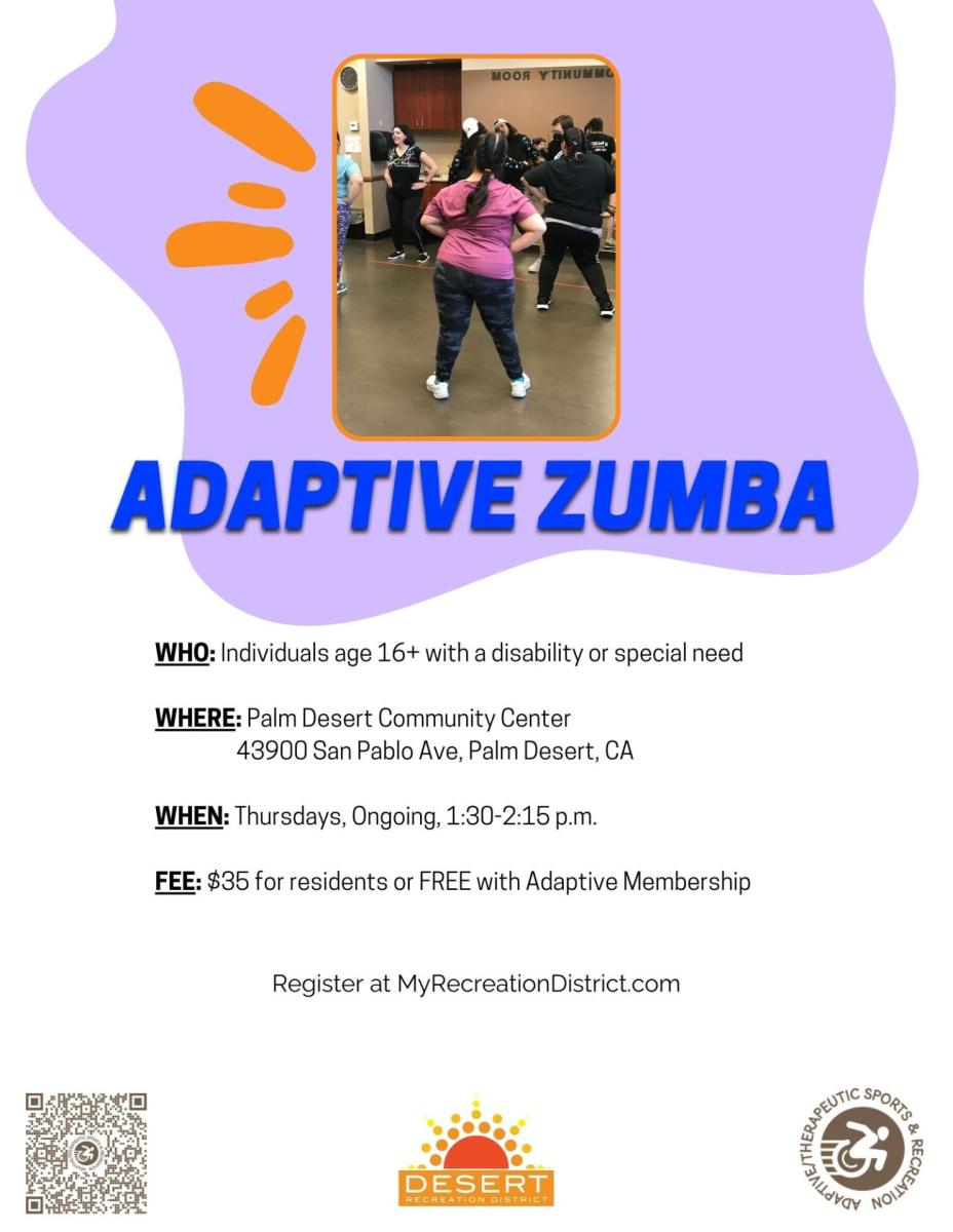 Adaptive Zumba Desert Recreation District - Palm Desert Community Center Adaptive Sports Event December 4, 2025 - 1:30pm - 2:15pmDecember 18, 2025 - 1:30pm - 2:15pmJanuary 8, 2026 - 1:30pm - 2:15pmJanuary 15, 2026 - 1:30pm - 2:15pmJanuary 22, 2026 - 1:30pm - 2:15pmJanuary 29, 2026 - 1:30pm - 2:15pmFebruary 5, 2026 - 1:30pm - 2:15pmFebruary 12, 2026 - 1:30pm - 2:15pmFebruary 19, 2026 - 1:30pm - 2:15pmFebruary 26, 2026 - 1:30pm - 2:15pm