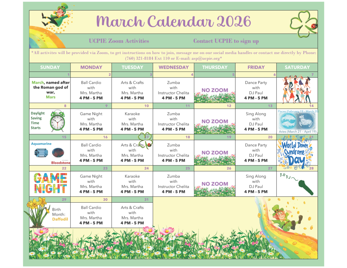 Arts & Crafts/Karaoke with Ms. Martha UCPIE - Online program supported by Zoom Adaptive Sports Event March 3, 2026 - 4:00pm - 5:00pmMarch 10, 2026 - 4:00pm - 5:00pmMarch 17, 2026 - 4:00pm - 5:00pmMarch 24, 2026 - 4:00pm - 5:00pmMarch 31, 2026 - 4:00pm - 5:00pmApril 7, 2026 - 4:00pm - 5:00pmApril 14, 2026 - 4:00pm - 5:00pmApril 21, 2026 - 4:00pm - 5:00pmApril 28, 2026 - 4:00pm - 5:00pm