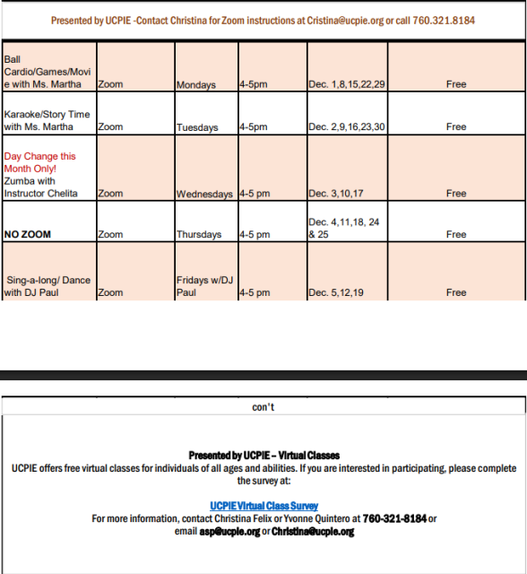 Ball Cardio/Games/Movie with Ms. Martha UCPIE - Online program supported by Zoom Adaptive Sports Event December 1, 2025 - 4:00pm - 5:00pmDecember 8, 2025 - 4:00pm - 5:00pmDecember 15, 2025 - 4:00pm - 5:00pmDecember 22, 2025 - 4:00pm - 5:00pmDecember 29, 2025 - 4:00pm - 5:00pmJanuary 5, 2026 - 4:00pm - 5:00pmJanuary 12, 2026 - 4:00pm - 5:00pmJanuary 19, 2026 - 4:00pm - 5:00pmJanuary 26, 2026 - 4:00pm - 5:00pm