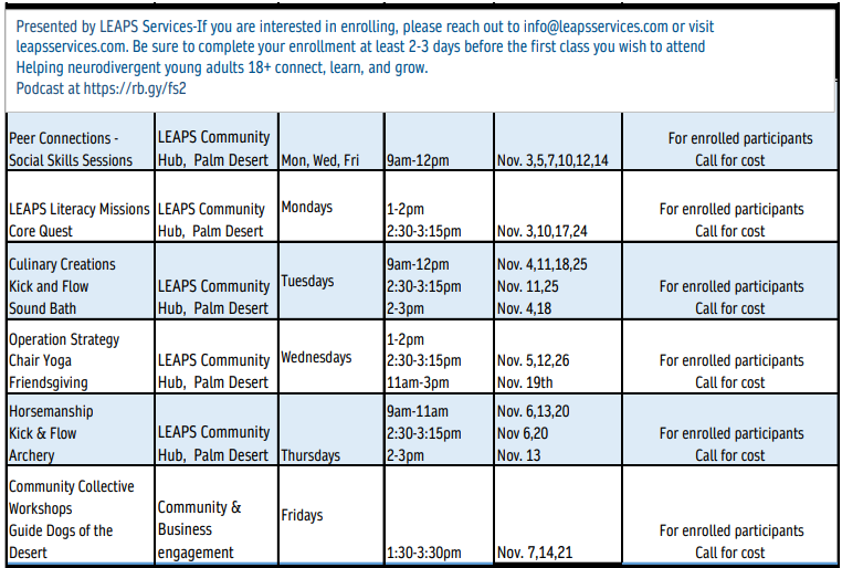 Chair Yoga LEAPS Services - LEAPS Community Hub, Palm Desert Adaptive Sports Event September 3, 2025 - 2:30pm - 3:15pmSeptember 10, 2025 - 2:30pm - 3:15pmSeptember 17, 2025 - 2:30pm - 3:15pmSeptember 24, 2025 - 2:30pm - 3:15pmOctober 1, 2025 - 2:30pm - 3:15pmOctober 8, 2025 - 2:30pm - 3:15pmOctober 15, 2025 - 2:30pm - 3:15pmOctober 22, 2025 - 2:30pm - 3:15pmOctober 29, 2025 - 2:30pm - 3:15pmNovember 5, 2025 - 2:30pm - 3:15pmNovember 12, 2025 - 2:30pm - 3:15pmNovember 26, 2025 - 2:30pm - 3:15pm