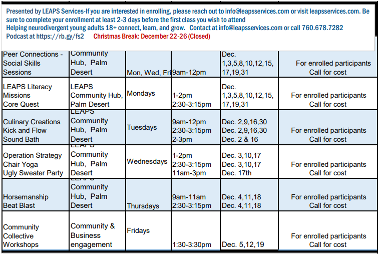 Chair Yoga LEAPS Services - LEAPS Community Hub, Palm Desert Adaptive Sports Event December 3, 2025 - 2:30pm - 3:15pmDecember 10, 2025 - 2:30pm - 3:15pmDecember 17, 2025 - 2:30pm - 3:15pmJanuary 7, 2026 - 2:30pm - 3:15pmJanuary 14, 2026 - 2:30pm - 3:15pmJanuary 21, 2026 - 2:30pm - 3:15pmJanuary 28, 2026 - 2:30pm - 3:15pm