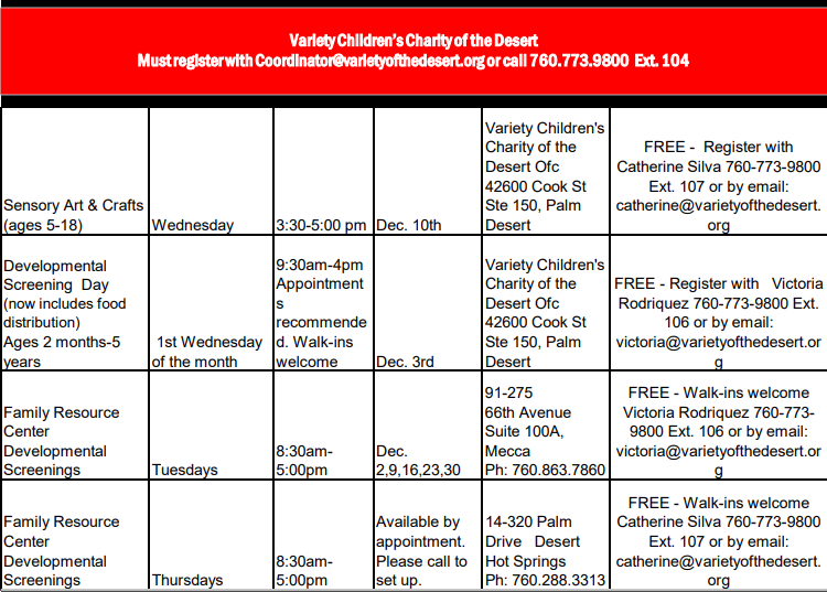 Developmental Screening Day [Ages 2 months - 5 years] Variety of the Desert - Palm Desert Adaptive Sports Event November 5, 2025 - 9:30am - 4:00pmDecember 3, 2025 - 9:30am - 4:00pmJanuary 7, 2026 - 9:30am - 4:00pm