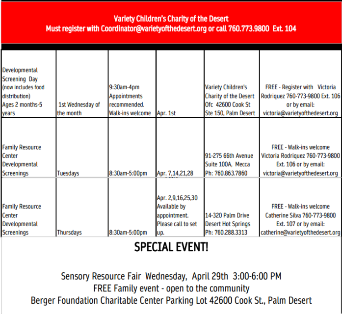 Developmental Screening Day [Ages 2 months - 5 years] Variety of the Desert - Palm Desert Adaptive Sports Event February 4, 2026 - 9:30am - 4:00pmMarch 4, 2026 - 9:30am - 4:00pmApril 1, 2026 - 9:30am - 4:00pmMay 6, 2026 - 9:30am - 4:00pmJune 3, 2026 - 9:30am - 4:00pm