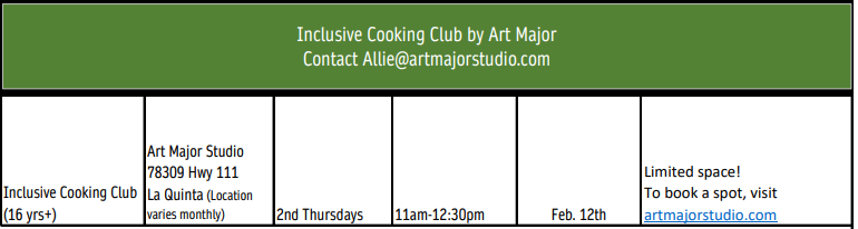 Inclusive Cooking Club [16+] Art Major Studio - La Quinta Adaptive Sports Event February 12, 2026 - 11:00am - 12:30pmMarch 12, 2026 - 11:00am - 12:30pm