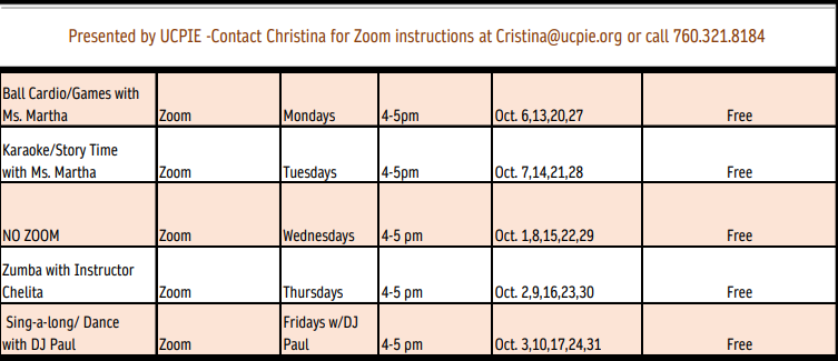 Karaoke/Story Time with Ms. Martha UCPIE - Online program supported by Zoom Adaptive Sports Event September 2, 2025 - 4:00pm - 5:00pmSeptember 9, 2025 - 4:00pm - 5:00pmSeptember 16, 2025 - 4:00pm - 5:00pmSeptember 23, 2025 - 4:00pm - 5:00pmSeptember 30, 2025 - 4:00pm - 5:00pmOctober 7, 2025 - 4:00pm - 5:00pmOctober 14, 2025 - 4:00pm - 5:00pmOctober 21, 2025 - 4:00pm - 5:00pmOctober 28, 2025 - 4:00pm - 5:00pmNovember 4, 2025 - 4:00pm - 5:00pmNovember 11, 2025 - 4:00pm - 5:00pmNovember 18, 2025 - 4:00pm - 5:00pmNovember 25, 2025 - 4:00pm - 5:00pm