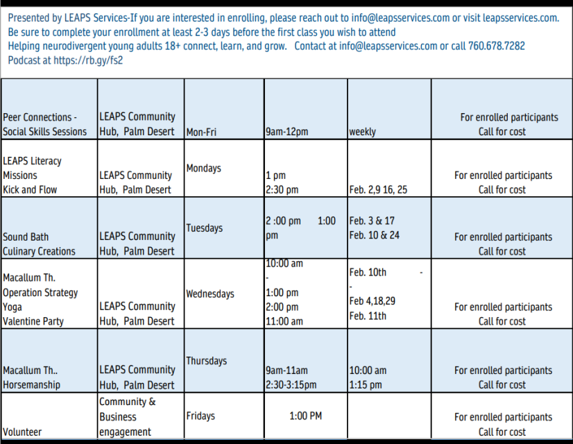 Peer Connections – Social Skills Sessions LEAPS Services - LEAPS Community Hub, Palm Desert Adaptive Sports Event February 2, 2026 - 9:00am - 12:00pmFebruary 3, 2026 - 9:00am - 12:00pmFebruary 4, 2026 - 9:00am - 12:00pmFebruary 5, 2026 - 9:00am - 12:00pmFebruary 6, 2026 - 9:00am - 12:00pmFebruary 9, 2026 - 9:00am - 12:00pmFebruary 10, 2026 - 9:00am - 12:00pmFebruary 11, 2026 - 9:00am - 12:00pmFebruary 12, 2026 - 9:00am - 12:00pmFebruary 13, 2026 - 9:00am - 12:00pmFebruary 16, 2026 - 9:00am - 12:00pmFebruary 17, 2026 - 9:00am - 12:00pmFebruary 18, 2026 - 9:00am - 12:00pmFebruary 19, 2026 - 9:00am - 12:00pmFebruary 20, 2026 - 9:00am - 12:00pmFebruary 23, 2026 - 9:00am - 12:00pmFebruary 24, 2026 - 9:00am - 12:00pmFebruary 25, 2026 - 9:00am - 12:00pmFebruary 26, 2026 - 9:00am - 12:00pmFebruary 27, 2026 - 9:00am - 12:00pmMarch 2, 2026 - 9:00am - 12:00pmMarch 3, 2026 - 9:00am - 12:00pmMarch 4, 2026 - 9:00am - 12:00pmMarch 5, 2026 - 9:00am - 12:00pmMarch 6, 2026 - 9:00am - 12:00pm