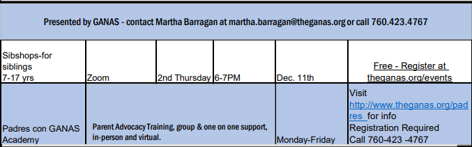 Sibshops – For Siblings 7-17 years The GANAS - Online program supported by Zoom Adaptive Sports Event November 13, 2025 - 6:00pm - 7:00pmDecember 11, 2025 - 6:00pm - 7:00pmJanuary 8, 2026 - 6:00pm - 7:00pm