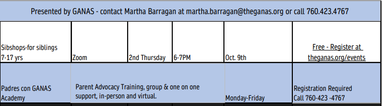 Sibshops – For Siblings 7-17 years The GANAS - Online program supported by Zoom Adaptive Sports Event January 11, 2024 - 5:30pm - 7:00pmFebruary 8, 2024 - 5:30pm - 7:00pmMarch 14, 2024 - 5:30pm - 7:00pmApril 11, 2024 - 5:30pm - 7:00pmMay 9, 2024 - 5:30pm - 7:00pmJune 13, 2024 - 5:30pm - 7:00pmJuly 11, 2024 - 5:30pm - 7:00pmAugust 8, 2024 - 5:30pm - 7:00pmSeptember 12, 2024 - 5:30pm - 7:00pmOctober 9, 2024 - 5:30pm - 7:00pmNovember 14, 2024 - 5:30pm - 7:00pmDecember 12, 2024 - 5:30pm - 7:00pmFebruary 13, 2025 - 6:00pm - 7:00pmMarch 13, 2025 - 6:00pm - 7:00pmApril 10, 2025 - 6:00pm - 7:00pmMay 8, 2025 - 6:00pm - 7:00pmJune 12, 2025 - 6:00pm - 7:00pmJuly 10, 2025 - 6:00pm - 7:00pmAugust 14, 2025 - 6:00pm - 7:00pmSeptember 11, 2025 - 6:00pm - 7:00pmOctober 9, 2025 - 6:00pm - 7:00pmNovember 13, 2025 - 6:00pm - 7:00pm