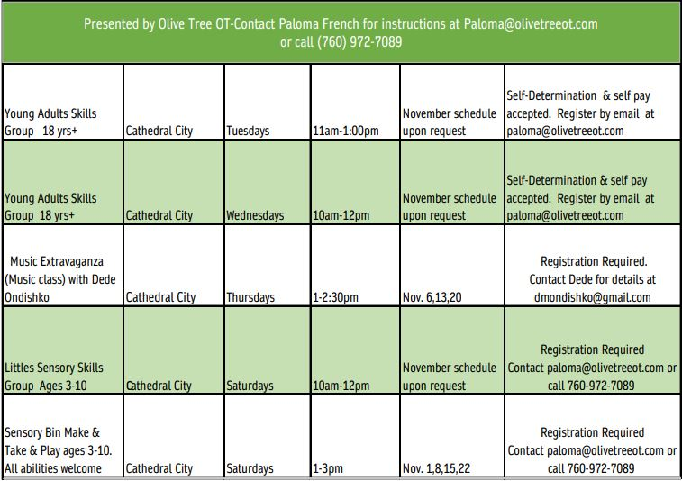 Young Adults Skills Group [18+] Olive Tree OT - Cathedral City Adaptive Sports Event September 30, 2025 - 11:00am - 1:00pmOctober 1, 2025 - 10:00am - 12:00pmOctober 7, 2025 - 11:00am - 1:00pmOctober 8, 2025 - 10:00am - 12:00pmOctober 14, 2025 - 11:00am - 1:00pmOctober 15, 2025 - 10:00am - 12:00pmOctober 21, 2025 - 11:00am - 1:00pmOctober 22, 2025 - 10:00am - 12:00pmOctober 28, 2025 - 11:00am - 1:00pmOctober 29, 2025 - 10:00am - 12:00pmNovember 4, 2025 - 11:00am - 1:00pmNovember 5, 2025 - 10:00am - 12:00pmNovember 11, 2025 - 11:00am - 1:00pmNovember 12, 2025 - 10:00am - 12:00pmNovember 18, 2025 - 11:00am - 1:00pmNovember 19, 2025 - 10:00am - 12:00pmNovember 25, 2025 - 11:00am - 1:00pmNovember 26, 2025 - 10:00am - 1:00pmDecember 2, 2025 - 11:00am - 1:00pmDecember 3, 2025 - 11:00am - 1:00pm